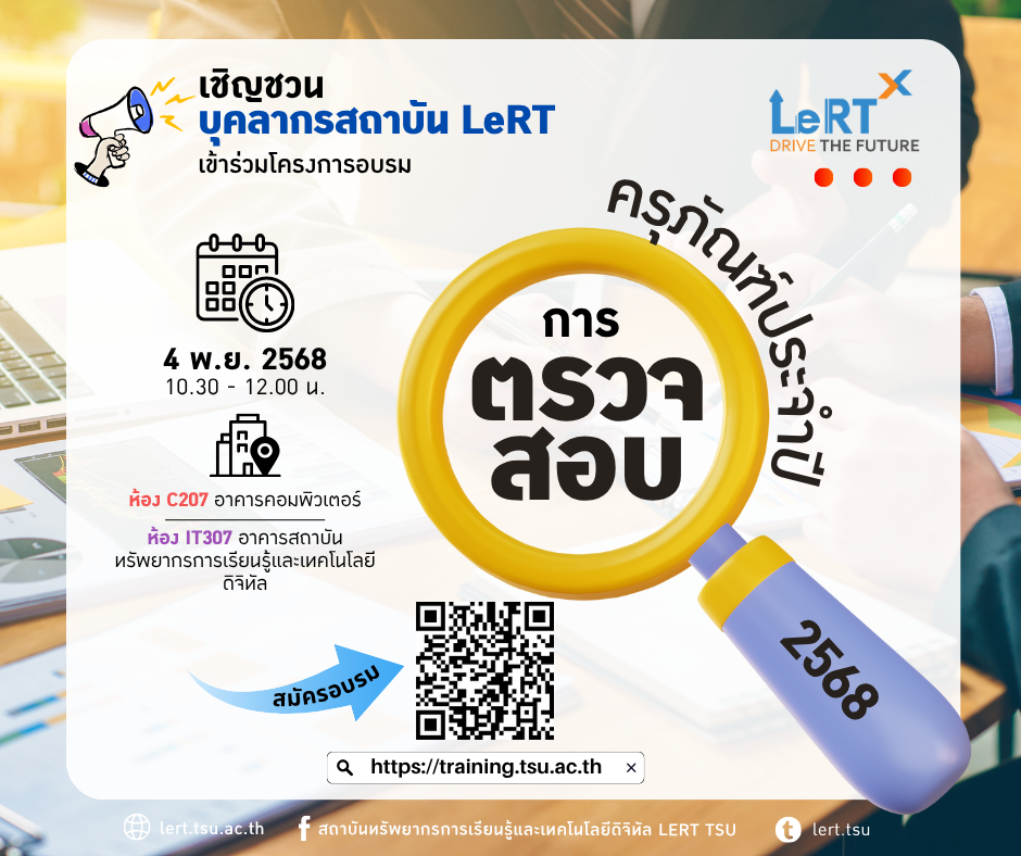 เปิดลงทะเบียน : 29/10/2568 - 04/11/2568 สำหรับ : บุคลากรสถาบันทรัพยากรการเรียนรู้และเทคโนโลยีดิจิทัล